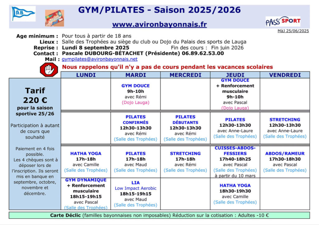 La Gym d’entretien est une préparation physique générale : assouplissements, étirements, tonification des abdos, fessiers, dorsaux.